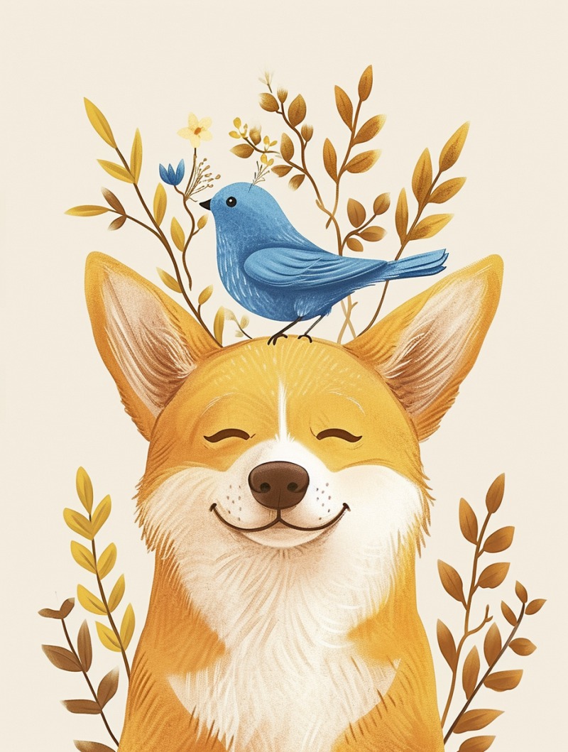 一个可爱的黄色小狗和小鸟一起的插画